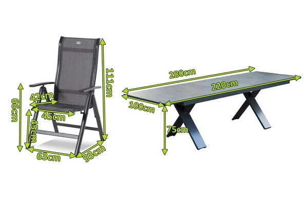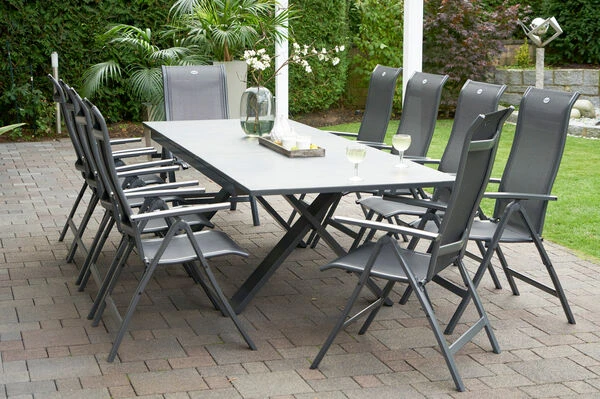 Der Tisch mit dem gekreuzten Gestell ist gefertigt aus pulverbeschichtetem Aluminium in der Farbe Xerix (Anthrazit) und wird optisch perfekt durch die Glaskeramik-Tischplatte, ebenfalls in der Farbe Xerix ergänzt. Die Maße von ca. 220 x 100 x 75 cm sorgen dafür, dass stets ausreichend Ablagefläche zur Verfügung steht. Bei Bedarf kann der Tisch auf eine Länge von ca. 280 cm ausgezogen werden, so finden bequem auch große Runden genügend Platz in Ihrem Garten. Dank der Ausziehfunktion hebt sich dieses Modell von den üblichen Tischen der Xanadu Serie ab – den Ausziehtisch erhalten Sie exklusiv bei uns.