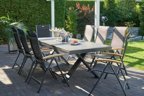 HARTMAN Sondermodell Xanadu / Alice Esstischgarnitur, xerix/schwarz, Alu/Glaskeramik, 4×4 Textilen, 8 Multipos, 220/280x100cm