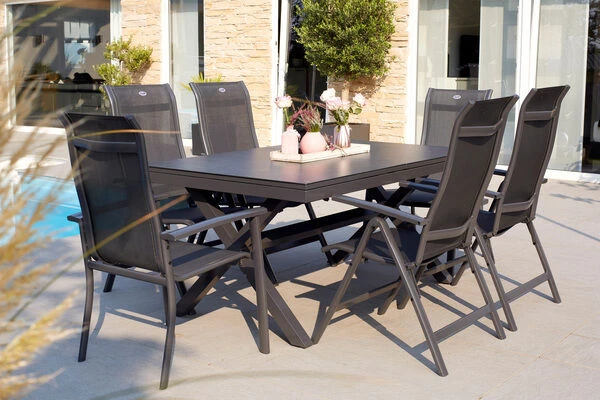 Hartman Esstischgarnitur mit Xanadu Ausziehtisch aus Alu, 2 Stapelsessel und 4 Multipositionssessel aus der Serie „Alice“