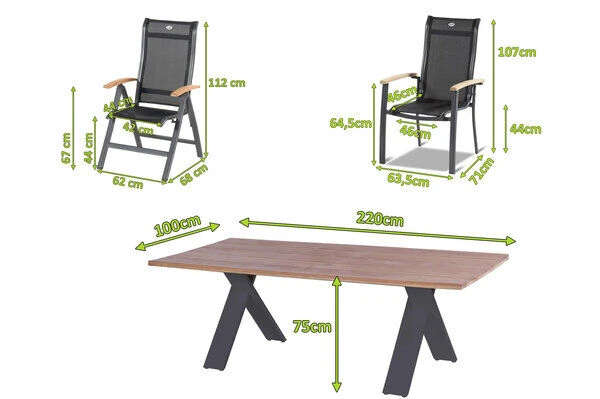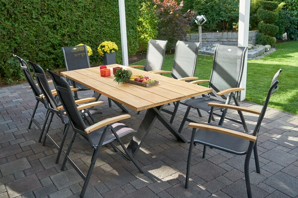 Der Tisch mit dem gekreuzten Gestell ist gefertigt aus pulverbeschichtetem Aluminium in der Farbe Xerix (Anthrazit) und wird optisch perfekt durch die Tischplatte aus SVLK-zertifiziertem Teakholz ergänzt. Die Maße von ca. 220 x 100 x 75 cm sorgen dafür, dass stets ausreichend Ablagefläche zur Verfügung steht und bequem 8 Personen genügend Platz finden.