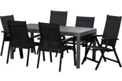 Bei dieser Esstischgruppe treffen hochwertige Materialien und Design auf modernste Weise aufeinander. Das Set besteht aus dem Esstisch „Yasmani“ mit den Maßen von ca. 240 x 100 x 76 cm, 6 Stapel- und 2 Multipositionssessel aus der „Raffaelo“-Serie in der Farbe „Xerix“ (Anthrazit).