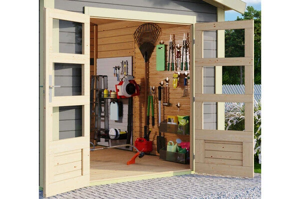 KARIBU Gartenhaus Theres 3, Terragrau, Fichtenholz 28mm, 270 X 244 X 242 Cm, Satteldach, Massivholzdach