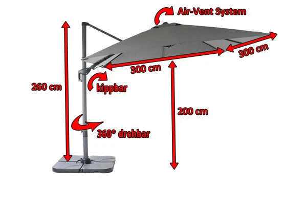 Der quadratische Sonnenschirm von OUTFLEXX® besticht durch seine hochwertig verarbeiteten Materialien und seine praktischen Funktionen. Das ca. 300 x 300 cm große Schirmtuch besteht aus 100% Polyester (ca. 200 g/m²) in anthrazit und ist wasserabweisend imprägniert. Das Gestell aus pulverbeschichtetem Aluminium in anthrazit hat eine Haupt-Rohrdicke von ca. 53 x 80 mm. Der Ampelschirm besitzt keinen Mittelmast und bietet daher eine praktische Lösung, um ohne Probleme eine komplette Sitzgruppe zu beschatten. Durch einen hohen UV-Schutz von 50+ spendet der Sonnenschirm dabei extra viel Schatten. Er verfügt außerdem über eine praktische 360° Drehfunktion des Schirmstocks – das Schirmdach kann so komfortabel mit der Sonne mitwandern und der Schattenwurf wird vergrößert, ohne dass der schwere Schirmsockel bewegt werden muss. Die Beschattung bei unterschiedlicher Sonneneinstrahlung ist mit diesem praktischen Ampelschirm problemlos möglich und Dank eines leichtgängigen Kurbelmechanismus lässt er sich kinderleicht aufspannen. Das integrierte Air-Vent System lässt auch bei sehr warmen Klima die Luft zirkulieren und sorgt außerdem dafür, dass Windböen nach oben entweichen können und den Schirm dabei nicht anheben. Die eingebauten Dachstreben mit den Maßen von ca. 14 x 24 mm sorgen für weitere Standfestigkeit. Im Lieferumfang ist ein Plattenständer für Wegplatten enthalten. Um einen sicheren Stand zu gewährleisten, empfehlen wir Ihnen den ca. 26 kg schweren Ampelschirm mit ca. 100 kg Wegplatten zu beschweren. Bitte beachten Sie, dass diese Platten NICHT mit im Lieferumfang enthalten sind.