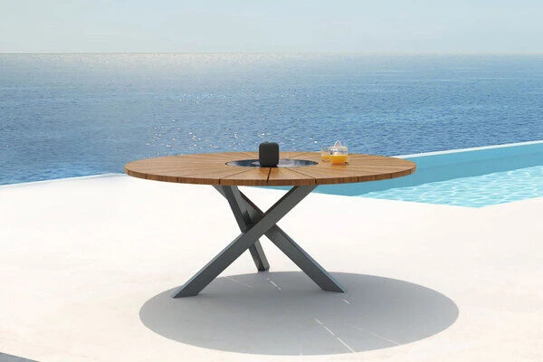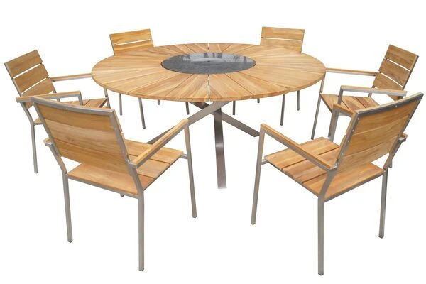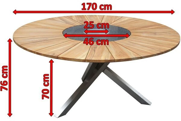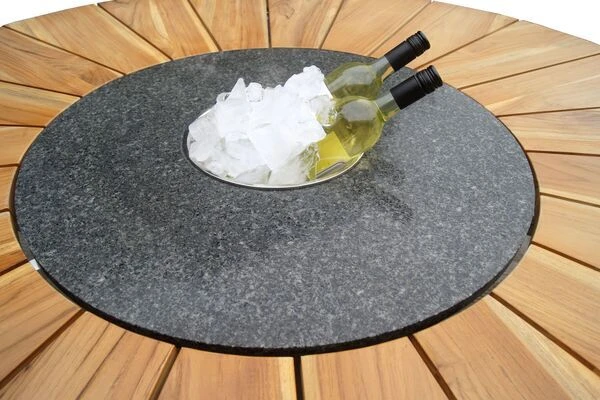 Die Besonderheit dieses Tisches liegt in der Funktionalität der Tischplatte, welche aus mehreren Komponenten besteht und für ein hohes Maß an Komfort sorgt. Die ca. Ø 170 cm große FSC®-zertifizierte Teakholztischplatte spendet genügend Platz für Teller, Gläser oder was sonst noch zu einem gemütlichen Grillabend mit der Familie gehört. Gewürze und Grillsoßen können auf dem ca. 46 cm breiten Granitring abgestellt werden. Dieser kann praktischerweise gedreht werden, sodass schwere Sachen nun nicht mehr quer über den Tisch gereicht werden müssen, sondern einfach und bequem zur anderen Seite des Tisches gedreht werden können. Ein weiteres Highlight finden Sie in der Mitte der Tischplatte – eine eingefasste, herausnehmbare Edelstahlplatte (ca. Ø 25 cm) kann bei Bedarf herausgenommen und durch den im Lieferumfang enthaltenen Eiskühler (ca. Ø 27 cm) ersetzt werden. So haben Sie ab sofort stets ein kühles Getränk zur Hand ohne dabei die gemütliche Runde verlassen zu müssen.