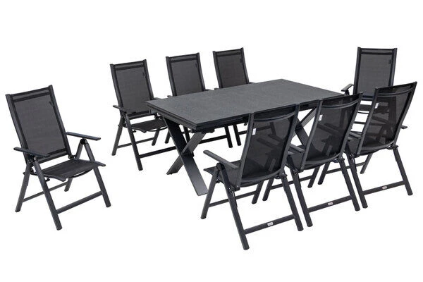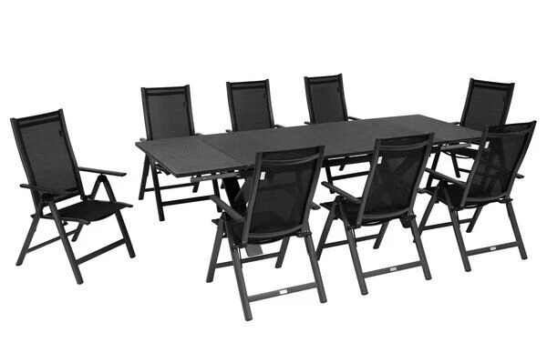9-teilige Esstischgarnitur von OUTFLEXX® mit Ausziehtisch 180/280x100cm und 8 Multipositionssesseln aus Aluminium/Textilene in schwarz