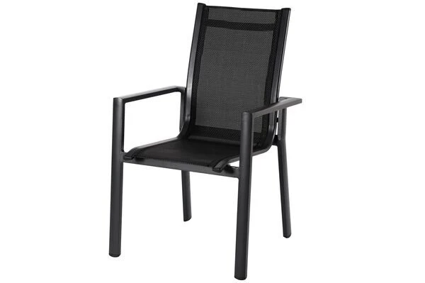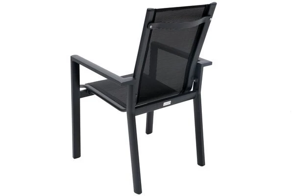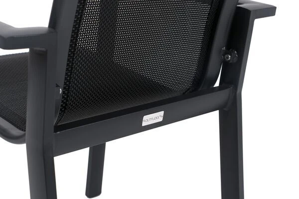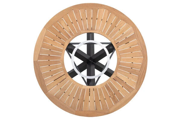 OUTFLEXX Esstischgarnitur, OUTFLEXX® Anthrazit Matt, Alu / Teak / Textil, Esstisch Ø 150 Cm, 5 Stapelsessel