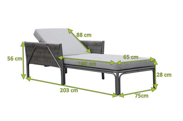 Auf dieser gemütlichen Loungeliege können Sie mit einem guten Buch in der Sonne liegen und nach einem langen Arbeitstag entspannen. Hierzu brauchen Sie einfach nur Platz zu nehmen und sich problemlos eine bequeme Liege- oder Sitzposition einstellen. Die Rückenlehne kann bequem 4 stufig verstellt werden. Die Liege hat ein Gesamtmaß von ca. 203 x 75 x 56 cm. Die Sitzfläche ist extra lang (ca. 190 cm), und die Liegehöhe mit ca. 28 cm extra hoch – so kommt die Entspannung beim Hinlegen von ganz allein. Die Armlehnen mit einer Höhe von ca. 56 cm sorgen bei dieser Liege für besonderen Komfort. Die Höhe der Rückenlehne lässt sich auf ca. 88 cm stellen und kann 4-fach verstellt werden.