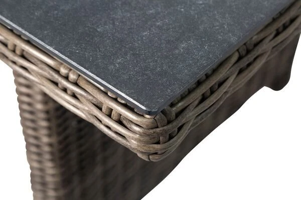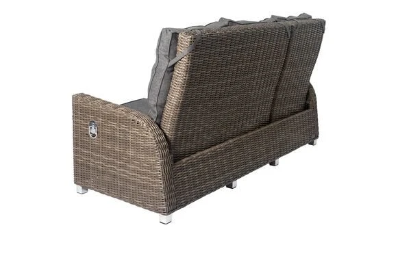 Das Untergestell des Möbelstücks besteht aus Aluminium, dies macht es nicht nur stabil, sondern sorgt auch dafür, dass es sich aufgrund des relativ geringen Gewichts ganz leicht hin und her stellen lässt. Das Aluminiumgestell wird mit Polyrattangeflecht bespannt. Das halbrunde Geflecht ist in der Farbe grau (Faser w5) gehalten und passt so wunderbar zu allen möglichen Terrasseneinrichtungen. Gemütliche Sitz- und Rückenpolster (100 % Olefin (200 g/m³)) mit einer Stärke von ca. 7 cm sorgen für höchsten Sitzkomfort. Farblich sind die grau melierten Polster perfekt auf das Geflecht abgestimmt. Die synthetische Faser Olefin wird für ihre Hitzebeständigkeit und optimalen Trage- und Pflegeeigenschaften geschätzt. Sollten Sie einmal Falten in Ihren Polstern haben, werden diese bei Wärme von alleine verschwinden, sodass die Bezüge komplett bügelfrei sind. Textilien aus Olefin sind bequem, hautkühlend, waschbar und bügelfrei. Sie eignen sich perfekt für den Einsatz im Freien, was nicht zuletzt an ihrer wasserabweisenden und atmungsaktiven Materialzusammensetzung liegt.