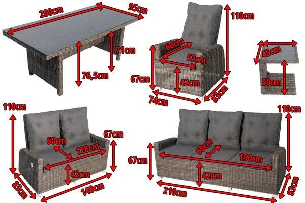 Dieses gemütliche Gartenmöbel Set bietet bequem bis zu sechs Personen Platz. Das Set besteht aus sechs Dining Sesseln, einem Dining 2-Sitzer Sofa, einem Dining 3-Sitzer Sofa, einem Dining Tisch und einem praktischen Beistelltisch. Hier können Sie bequem Ihr Mittag- oder Abendessen zu sich nehmen – und danach mit einem guten Buch in der Sonne liegen. Hierzu brauchen Sie einfach nur Platz zu nehmen und beim Sessel und den Sofas problemlos eine bequeme Liege- oder Sitzposition einstellen. Dies gelingt kinderleicht dank der integrierten Gasdruckfeder – die Rückenlehnen können einzeln mit einem kleinen Hebel an der Seite stufenlos verstellt werden. Außerdem lässt sich beim 3-Sitzer die Sitzfläche 5-fach verstellen, sodass eine perfekte Liegeposition entsteht. Der Sessel hat ein Gesamtmaß von ca. 83 x 74 x 110 cm. Die Sitzfläche ist ca. 60 cm tief, die Sitzhöhe mit Kissen liegt bei ca. 49 cm. Die Armlehnen mit einer Höhe von ca. 67 cm sorgen bei diesem Sessel für besonderen Komfort. Die Sofas haben Maße von ca. 148 x 83 x 110 cm bzw. 210 x 83 x 110 cm. Die Sitzfläche ist ca. 60 cm tief, so kommt die Entspannung beim Hinsetzen von ganz allein. Der praktische Diningtisch bietet dank seiner Maße von ca. 200 x 95 x 76,5 cm Platz für sechs bis acht Personen – so steht einem gemütlichen Mittagessen mit der Familie nichts im Wege. Er wird mit einer ca. 6 mm starken Spraystone Platte geliefert. Spraystone ist ein Kunststoff-Stein-Gemisch, das bei diesem Artikel auf Sicherheitsglas aufgesprüht und anschließend eingebrannt wird. Daraus ergibt sich eine wetter- und kratzfeste sowie pflegeleichte Oberfläche in einer eleganten Natursteinoptik, die sich mit einem milden Reiniger und einem Lappen kinderleicht pflegen lässt. Der Beistelltisch, ebenfalls mit einer ca. 8 mm dicken Spraystone-Platte, ergänzt das Set mit Maßen von ca. 45 x 45 x 50 cm perfekt.