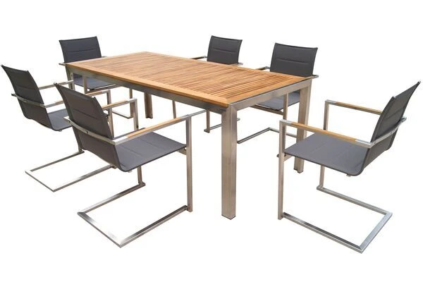 Teakholz und Edelstahl sind besonders witterungsbeständig und halten sowohl Frost und Hitze als auch Feuchtigkeit und Regen aus. Teakholz hat aufgrund des hohen Anteils an holzeigenen Ölen einen natürlichen Schutz gegen Pilze und Schädlinge. So beschränkt sich die Pflege Ihrer neuen Gartenmöbel auf ein Minimum und Sie können Ihre Zeit im Garten mit angenehmen Tätigkeiten verbringen.