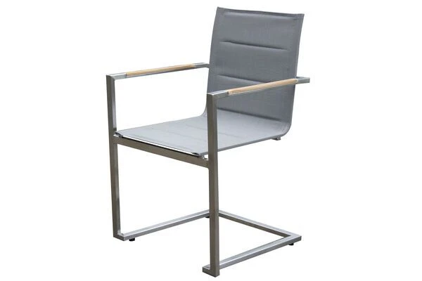 Die zeitlosen Stühle besitzen eine Bespannung aus hochwertigem Textilen in der Farbe taupe, hergestellt aus 70% Polyvinylchlorid und 30% Polyester. Das witterungsbeständige Material ist durch seine Flexibilität und seine zusätzliche Polsterung (padded) auch ohne Auflagen sehr bequem. Das formstabile Gewebe nimmt kein Wasser auf, ist atmungsaktiv und trocknet nach einem kurzen Schauer sehr schnell. Das sorgfältig verarbeitete Gestell aus rostfreiem 304er Edelstahl passt ideal zu den übrigen verwendeten Materialien, sodass ein harmonisches und elegantes Gesamtbild entsteht. Die hochwertigen Materialien und die sorgfältige Verarbeitung sorgen nicht nur für die besondere Optik dieser Stühle, sondern machen sie mit einer Belastbarkeit von ca. 150 kg sehr stabil.
