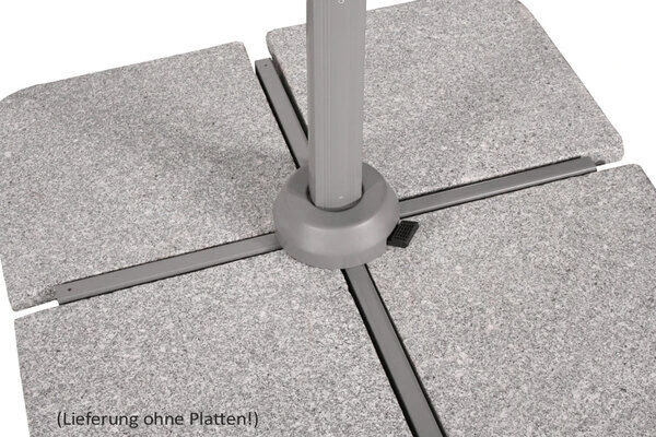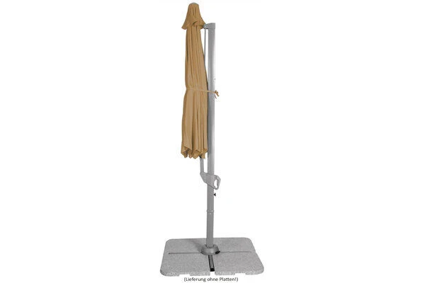 Für das Gestell wird ein in silbergrau pulverbeschichtetes Gemisch aus Stahl und Aluminium verwendet. Bei dem Schirmtuch mit einem Durchmesser von ca. 330 cm kommt ein verrottungsfestes und wasserabstoßend imprägniertes Gewebe aus 100% Polyester (ca. 200 g/m²) zum Einsatz. Damit der Sonnenschirm auch bei stärkeren Windböen stets festen Stand behält, befindet sich am oberen Ende des Schirms eine Belüftungsöffnung – das sogenannte Air-Vent. Durch den Drehteller wird Ihnen ein müheloses Drehen des Schirmes um 360° ermöglicht. Des Weiteren ist der Schirm neigbar bis ca. 408 cm. Damit Sie entspannt und sorgenfrei unter Ihrem neuen Ampelschirm relaxen können, besitzt auch dieser den wirkungsvollen und ausführlich nach der australisch-neuseeländischen Norm (AS/NZS4399:1996) getesteten 40+ UV-Schutz. Lehnen Sie sich zurück und genießen Sie die nächsten Sonnenstrahlen in Ihrem eigenen Garten. Die Streben haben die Maße von ca. 14 x 21 mm und sorgen mit dem sehr stabilen Strebengelenk für hohe Standfestigkeit. Zusätzlich erhalten Sie einen Plattenständer für Wegeplatten von ca. 50 x 50 x 5 cm. (Bitte beachten Sie: die Wegeplatten sind NICHT im Lieferumfang enthalten!)