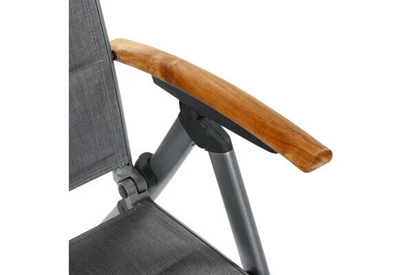 Der Klappsessel ist nicht nur ein Highlight in Sachen Optik, sondern weiß auch durch seinen Komfort und durch seine qualitative Verarbeitung zu überzeugen. Für ein komfortables Sitzen sorgt die hochwertige Texfabric Bespannung, die den Klappsessel auch ohne Auflagen äußerst bequem macht. Außerdem ist die Rückenlehne 10-fach verstellbar, sodass der Sessel je nach Bedarf in eine Sitz- oder Liegeposition gebracht werden kann. Das zeitlose Design aus einem Aluminiumgestell mit einer Textilenbespannung in der Farbe grau, macht den Sessel zu einem optischen Highlight für jede Terrasse. Armlehnen aus Teakholz ergänzen das edle Design. Dank der verwendeten Materialien hat dieser Multipositionssessel das sehr geringe Eigengewicht von ca. 5,9 kg, wodurch er leicht zu handhaben ist und bei Bedarf schnell und einfach zusammengeklappt und platzsparend verstaut werden kann.