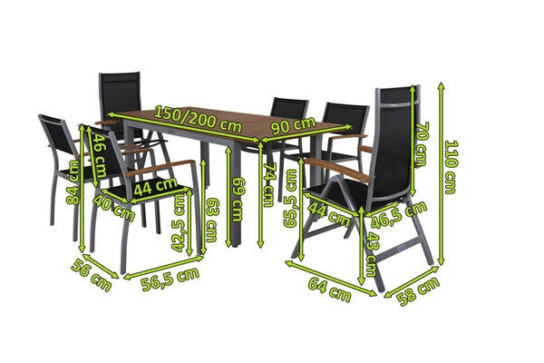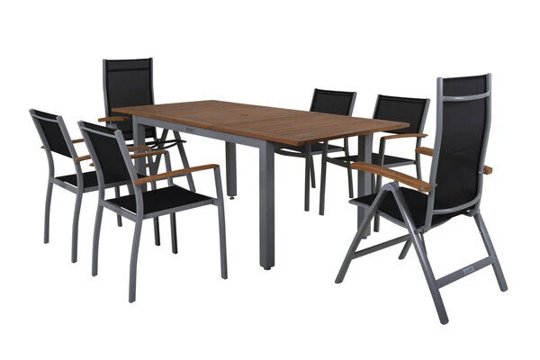 Diese Villana Esstischgruppe bietet genügend Platz für sechs Personen und besitzt auch in Sachen Komfort und Verarbeitung nur die beste Qualität. Die Farb- und Materialkombination aus Silber, Schwarz, Aluminium, Textilene und FSC-Akazienholz sorgt für eine rustikale Eleganz, welche die vielfältige Kombination mit anderen Möbelstücken oder Dekoration ermöglicht. Der Tisch kann bis auf eine Länge von ca. 200 cm ausgezogen werden – perfekt wenn sich noch spontaner Besuch ankündigt oder Sie einen schönen Grillabend mit Freunden und Nachbarn planen.