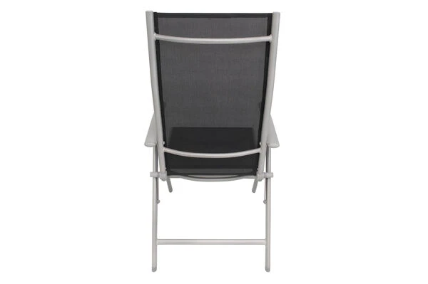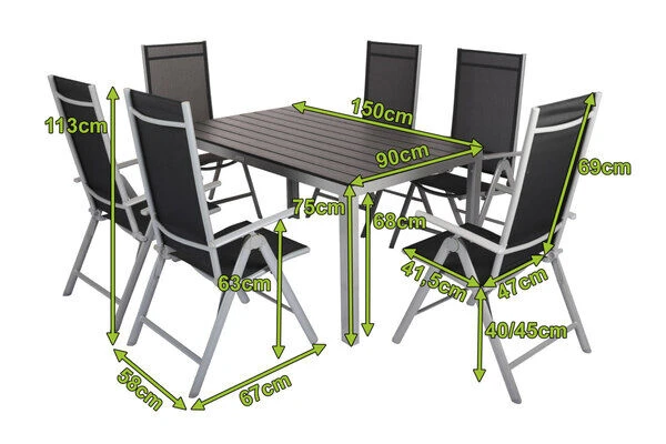 Diese Esstischgarnitur besteht aus einem Gartentisch und 6 bequemen Sesseln – perfekt, für eine gemütliche Runde aus Freunden, Familie oder Nachbarn. Bei Bedarf können Sie diese Gruppe mit passenden Artikeln der VILLANA Serie erweitern. Die Multipositionssessel sind modern und praktisch zugleich! Die Sessel haben ein Gestell aus pulverbeschichtetem Aluminium in der Farbe Silber und Maße von jeweils ca. 67 x 58 x 113 cm. Aluminium ist ein gern verwendetes Material im Gartenmöbelsektor, da es besonders leicht, zeitgleich jedoch sehr stabil ist. Dazu kommt der geringe Pflegeaufwand durch die Pulverbeschichtung. Die meisten Verschmutzungen lassen sich unkompliziert mit Wasser aufweichen und anschließend abspülen oder mit einem weichen Schwamm entfernen. Bei Nichtgebrauch lassen sich die Sessel stapeln und platzsparend verstauen. Dazu ist das Leichtgewicht mit ca. 4,3 kg besonders stabil und beeindruckt mit einer maximalen Belastbarkeit von ca. 160 kg. Dabei kommt der Komfort nicht zu kurz! Die geteilte Sitz- und Rückenfläche ist mit dem modernen Material Textilene (70% Polyvinylchlorid, 30% Polyester) in der Farbe Schwarz bespannt. Das Kunststoffgewebe zeichnet sich vor allem durch seine hohe Belastbarkeit und seinen hohen Komfort aus. Zudem ist es frost- und hitzebeständig, was zusammen mit der hohen Lichtbeständigkeit für eine lange Attraktivität Ihrer Sitzmöbel sorgt. Auch nimmt Textilene kaum Feuchtigkeit auf, so dass die Sitzfläche nach einem Regenschauer schnell wieder trocken ist. Mit einer Sitzbreite von ca. 47 cm und einer Sitztiefe von ca. 41,5 cm wollen Sie aus diesem Stuhl gar nicht mehr aufstehen! Für das Plus an Komfort bietet Ihnen der Multipositionssessel eine 8-fach verstellbare Rückenlehne – lehnen Sie sich zurück und lassen Sie die Alltagssorgen hinter sich.