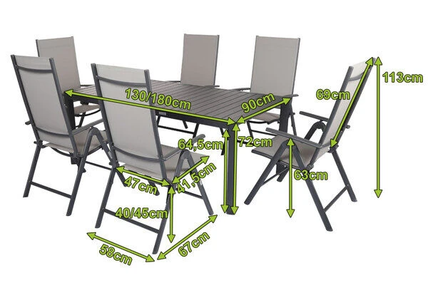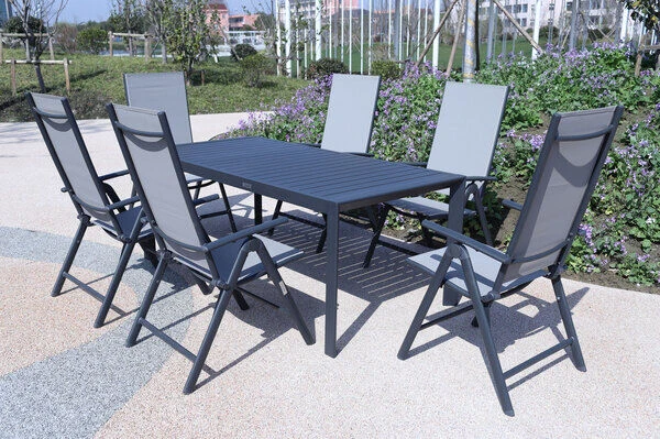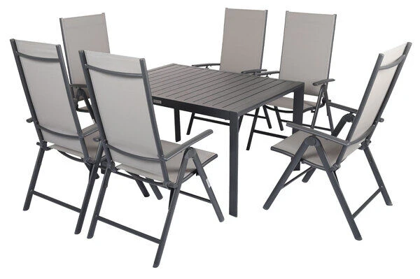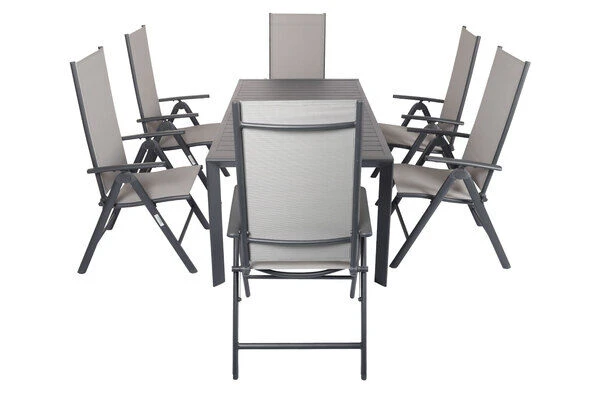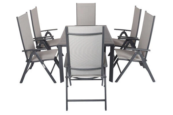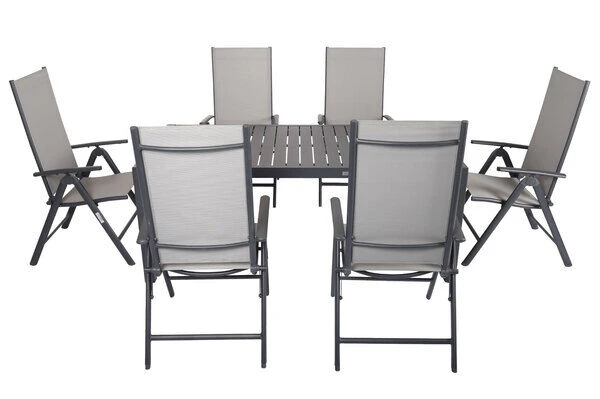 Diese Esstischgarnitur besteht aus einem Ausziehtisch und 6 bequemen Sesseln – perfekt, für eine gemütliche Runde aus Freunden, Familie oder Nachbarn. Bei Bedarf können Sie diese Gruppe mit passenden Artikeln der VILLANA Serie erweitern. Die Multipositionssessel sind modern und praktisch zugleich! Die Sessel haben ein Gestell aus pulverbeschichtetem Aluminium in der Farbe Anthrazit und Maße von jeweils ca. 67 x 58 x 113 cm. Aluminium ist ein gern verwendetes Material im Gartenmöbelsektor, da es besonders leicht, zeitgleich jedoch sehr stabil ist. Dazu kommt der geringe Pflegeaufwand durch die Pulverbeschichtung. Die meisten Verschmutzungen lassen sich unkompliziert mit Wasser aufweichen und anschließend abspülen oder mit einem weichen Schwamm entfernen. Bei Nichtgebrauch lassen sich die Sessel stapeln und platzsparend verstauen. Dazu ist das Leichtgewicht mit ca. 4,3 kg besonders stabil und beeindruckt mit einer maximalen Belastbarkeit von ca. 160 kg. Dabei kommt der Komfort nicht zu kurz! Die geteilte Sitz- und Rückenfläche ist mit dem modernen Material Textilene (70% Polyvinylchlorid, 30% Polyester) in der Farbe Grau bespannt. Das Kunststoffgewebe zeichnet sich vor allem durch seine hohe Belastbarkeit und seinen hohen Komfort aus. Zudem ist es frost- und hitzebeständig, was zusammen mit der hohen Lichtbeständigkeit für eine lange Attraktivität Ihrer Sitzmöbel sorgt. Auch nimmt Textilene kaum Feuchtigkeit auf, so dass die Sitzfläche nach einem Regenschauer schnell wieder trocken ist. Mit einer Sitzbreite von ca. 47 cm und einer Sitztiefe von ca. 41,5 cm wollen Sie aus diesem Stuhl gar nicht mehr aufstehen! Für das Plus an Komfort bietet Ihnen der Multipositionssessel eine 8-fach verstellbare Rückenlehne – lehnen Sie sich zurück und lassen Sie die Alltagssorgen hinter sich.