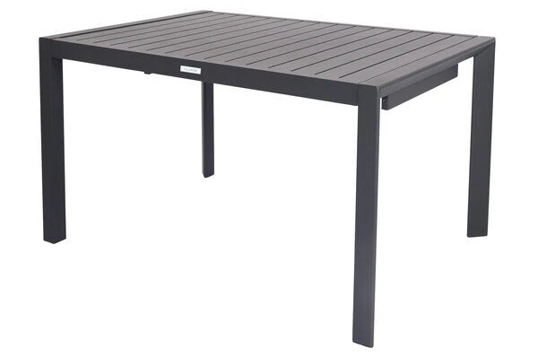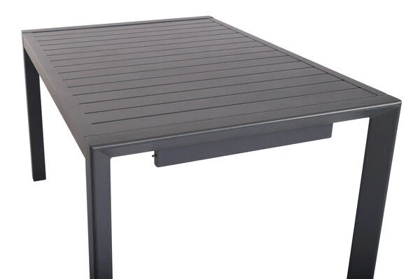 Der optisch zeitlose Ausziehtisch ist rein aus Aluminium gefertigt und besitzt ebenfalls eine Pulverbeschichtung in der Farbe Anthrazit. Zusammengefahren hat der Tisch bereits eine Größe von ca. 130 x 90 x 72 cm. Dabei beträgt der Abstand zwischen den Tischbeinen längs ca. 115 cm. Um die volle Größe des Tisches zu erhalten, ziehen Sie den Tisch einfach an der Auszugsseite aus. Unter der oberen Tischplatte kommt die Einlage zur Verlängerung der Tischplatte zum Vorschein. Diese müssen Sie manuell herausnehmen und auf das Gestell der Tischplatte legen. Letzlich werden durch das Zusammenschieben von Tischgestell und Einlegeplatte die Pins in die dafür vorgesehenen Löcher geschoben und es entsteht ein insgesamt größerer Tisch. Der ausgezogene Tisch weist nun eine Gesamtlänge von ca. 180 cm auf. Im ausgezogenen Zustand besitzt der Tisch längs einen Abstand von ca. 168 cm zwischen den Tischbeinen. Den Mechanismus finden Sie auch in der Bildergalerie des Sets. Der Clou: Im Gegensatz zu anderen Ausziehtischen haben Sie hier keine freischwebende Tischplatte, sondern die Tischplatte liegt bündig auf dem Untergestell auf. Die ca. 2 cm dicke Tischplatte bildet ein zuverlässiges Element des Tisches. Durch die geschickte Verarbeitung besitzt das Gestell eine besonders hohe Stabilität und dank des Gewichtes von ca. 22,7 kg ist der Tisch bis ca. 50 kg belastbar. Mit der Tischunterkante in Höhe von ca. 64,5 cm lassen sich die Stühle problemlos unter die Tischplatte schieben. Zusätzliche Fußkappen vermeiden unschöne Kratzer auf Ihrer Terrasse und bieten zugleich Schutz für Ihre Möbel.